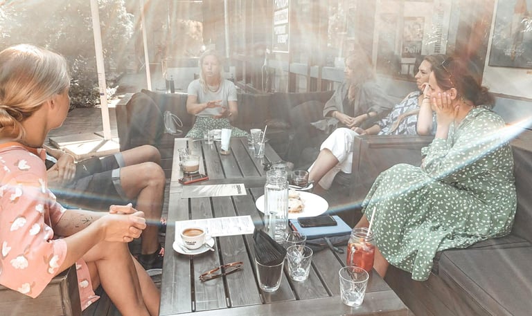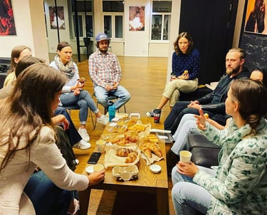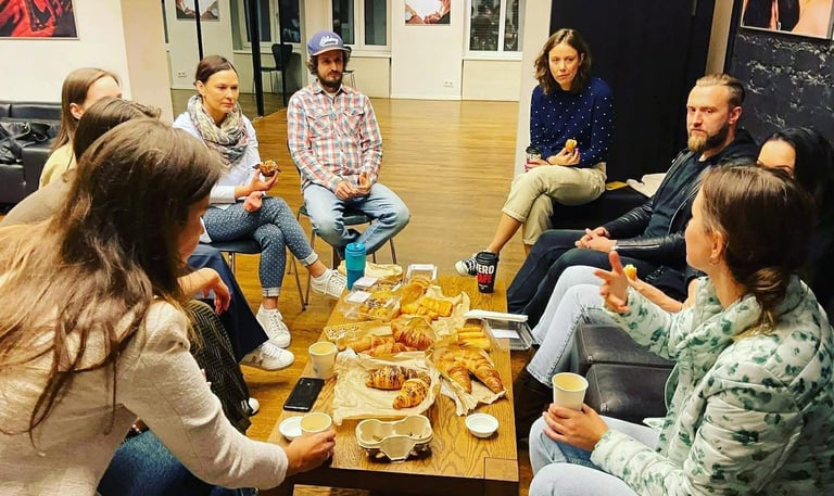 Tai susitikimai, kuriuose dalinamės patirtimi, palaikome vieni kitus ir augame kartu kūrybos kelyje. Čia saugi erdvė būti savimi – su savo idėjomis, abejonėmis ir ieškojimais. Pokalbiai gimsta natūraliai, be spaudimo būti „teisingiems“ ar „tobuliems“.